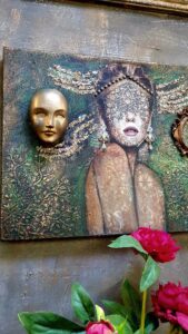 Το πρόσωπο της μορφής καλύπτεται από ένα περίτεχνο πέπλο, σαν σύμβολο κρυμμένων σκέψεων και ανείπωτων λέξεων.